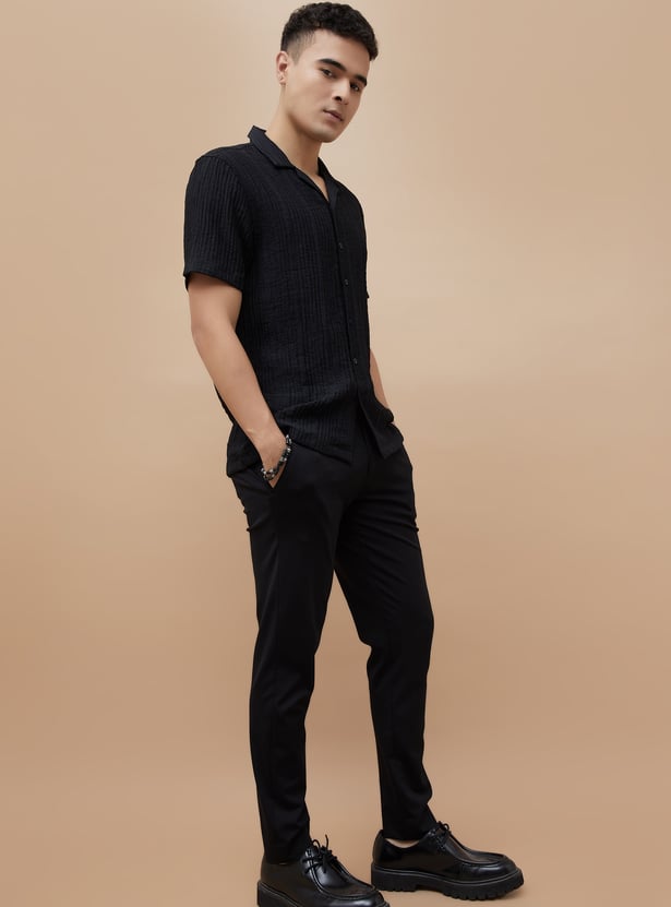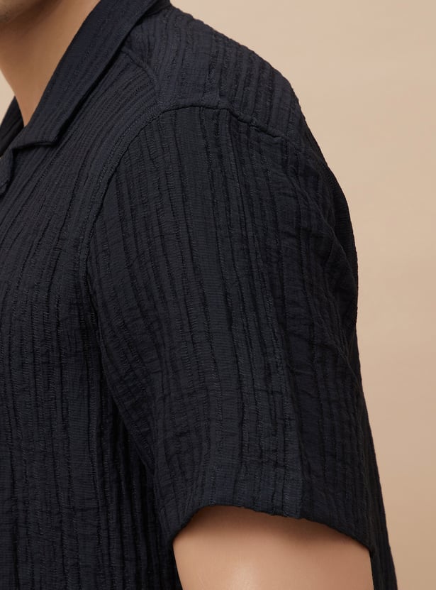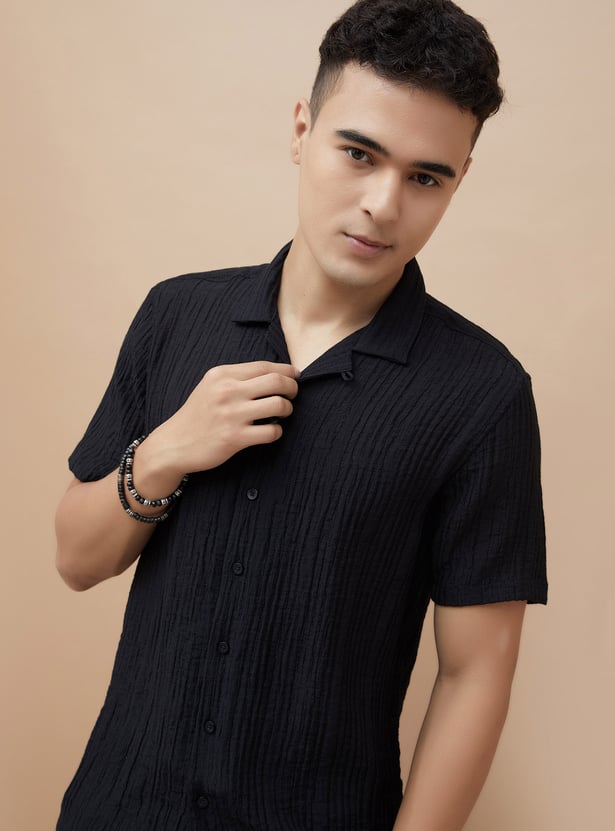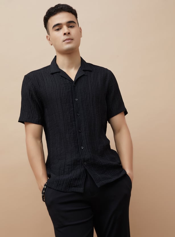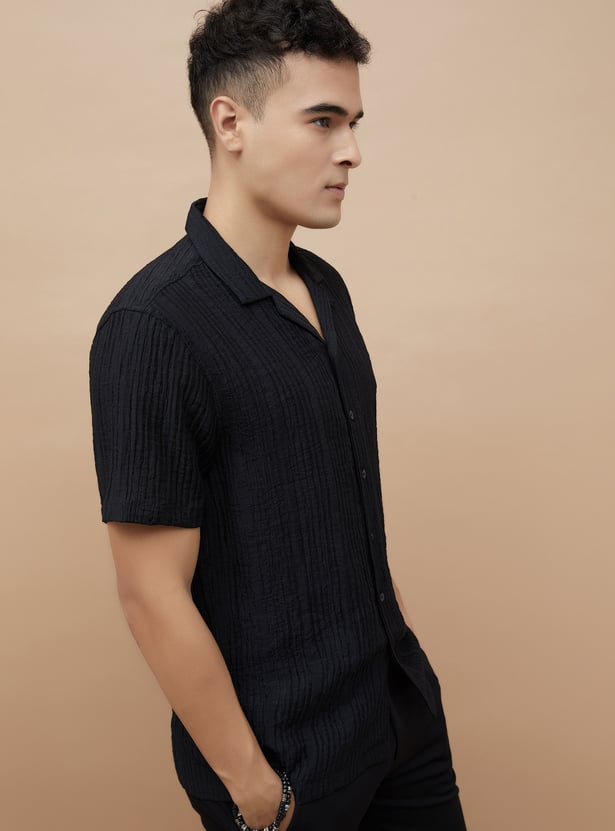 + Free ShippingAdd an extant twist to your casual collection with this stunning shirt designed with a textured surface, half sleeves, a button placket, cuban collar, and a curved hemline.